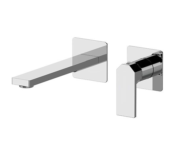 Miscelatore monocomando a incasso per lavabo, su due piastre tonde separate. Lunghezza bocca 18,5 cm.