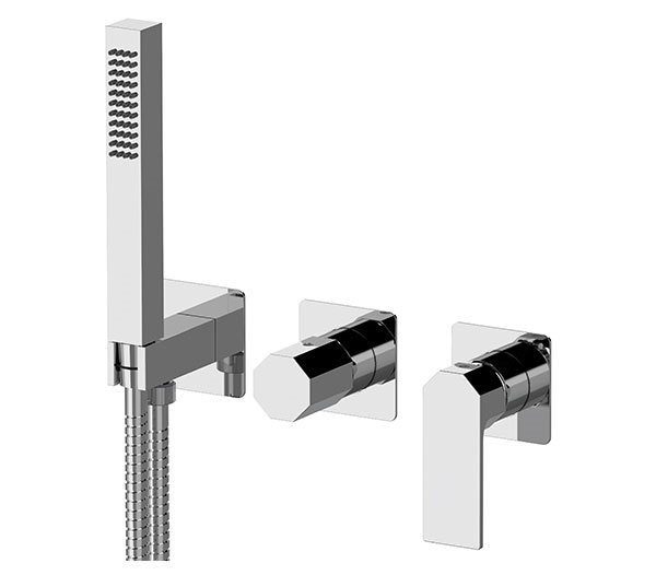 Set miscelatore a incasso a 2 vie per vasca/doccia su 3 piastre tonde ultra-piatte (parte a incasso unica), include: miscelatore, deviatore a 2 uscite, presa acqua con supporto, doccetta in ottone e flessibile 150 cm. Da completare con la seconda uscita.