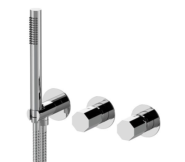 Set miscelatore a incasso a 2 vie per vasca/doccia su 3 piastre tonde ultra-piatte (parte a incasso unica), include: miscelatore, deviatore a 2 uscite, presa acqua con supporto, doccetta in ottone e flessibile 150 cm. Da completare con la seconda uscita.